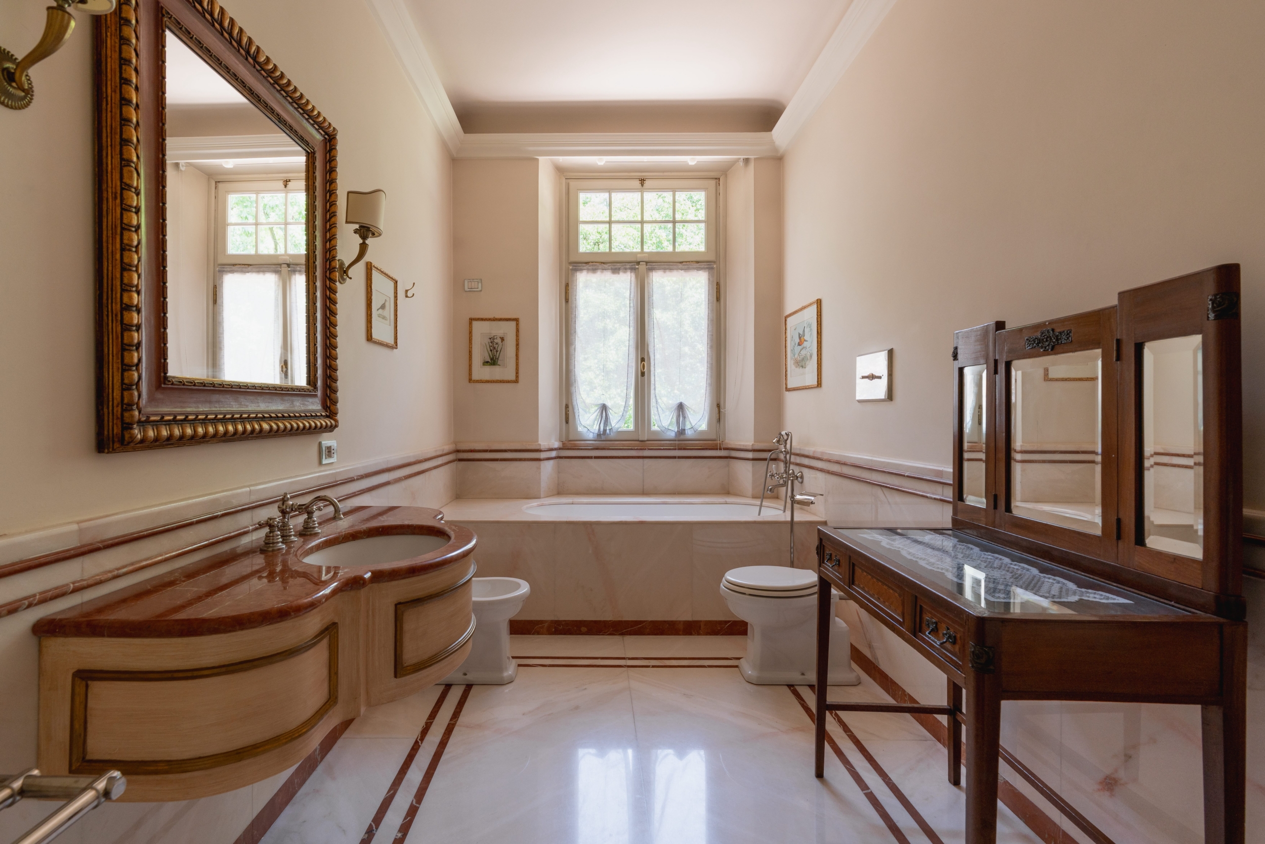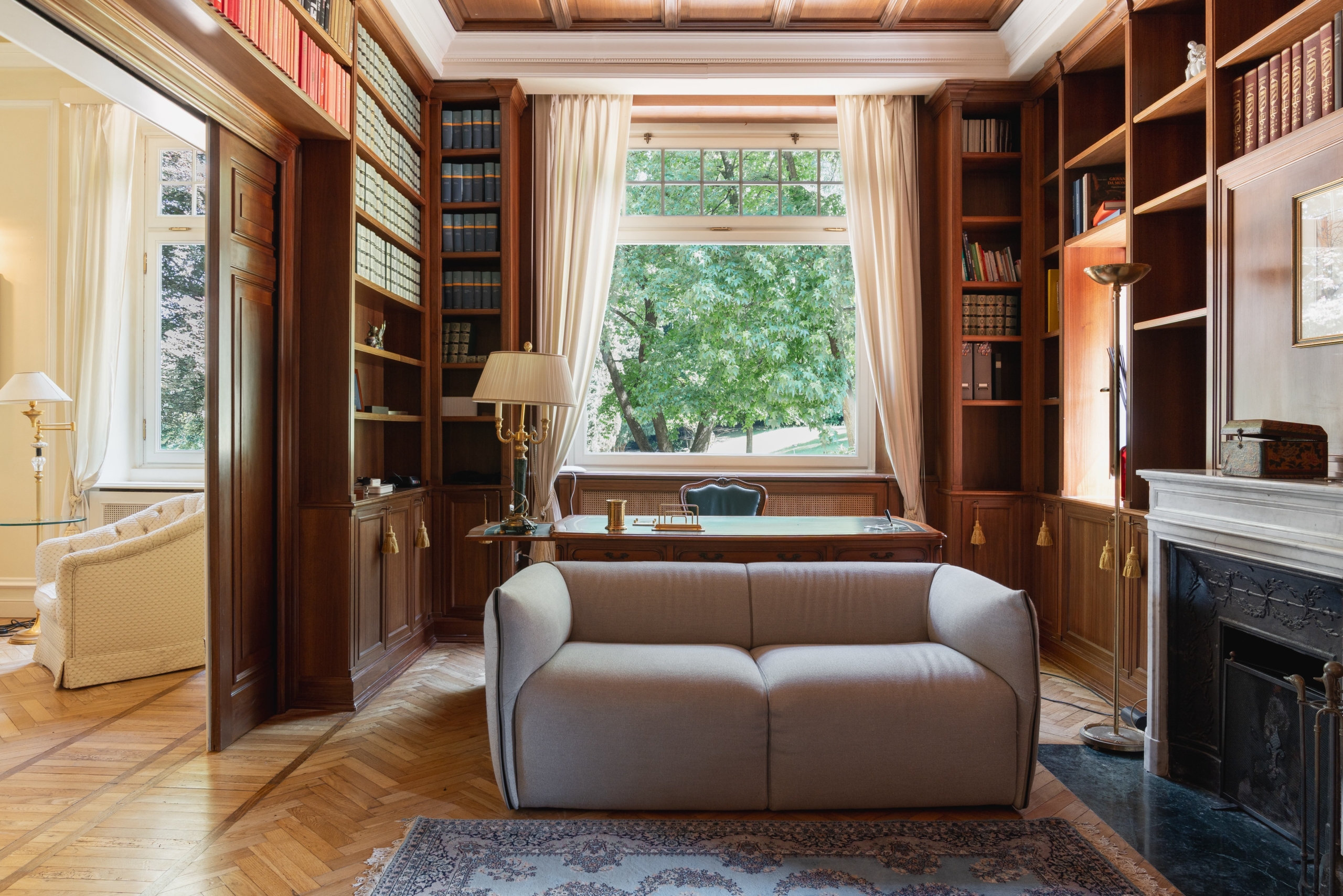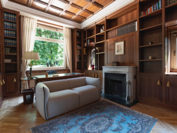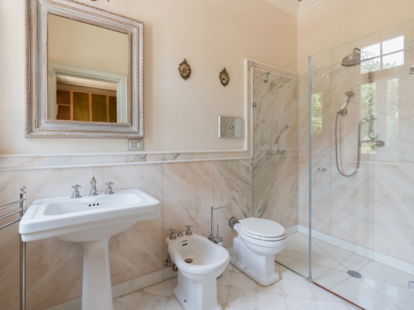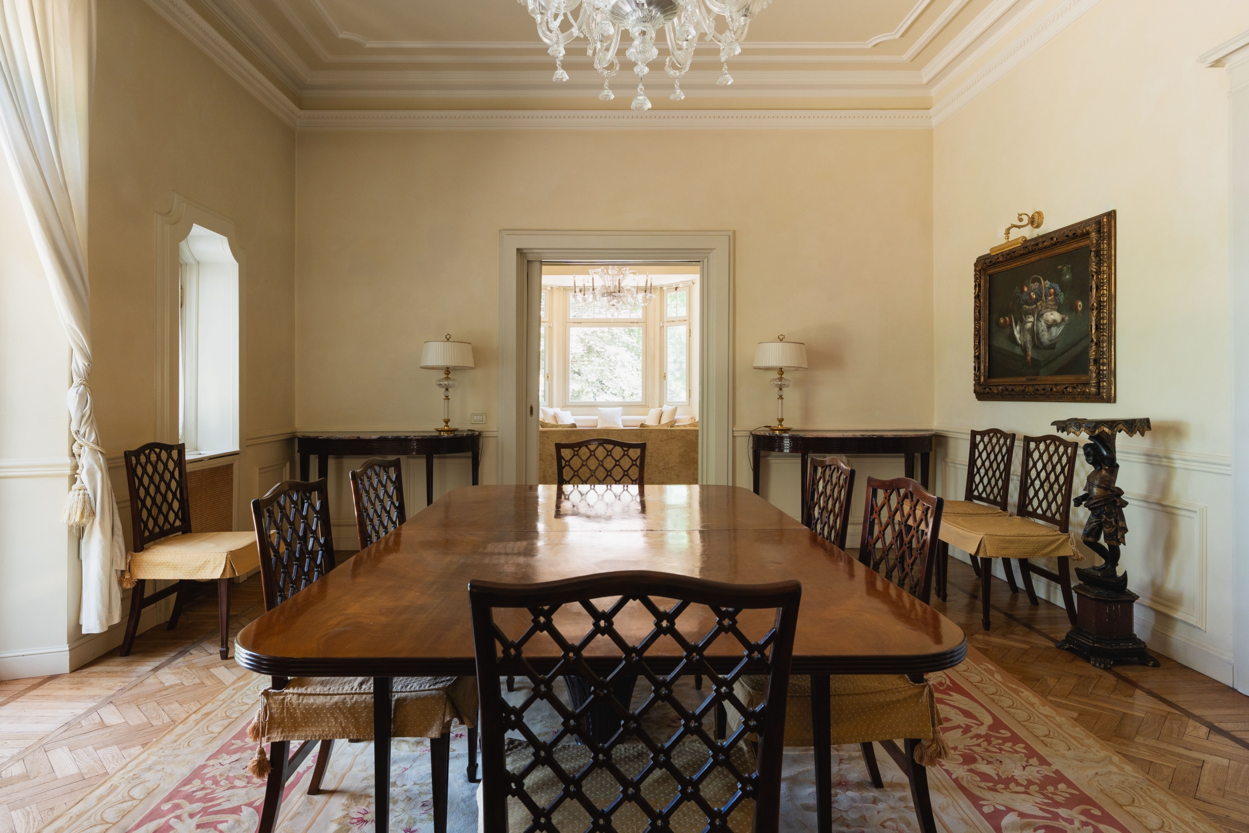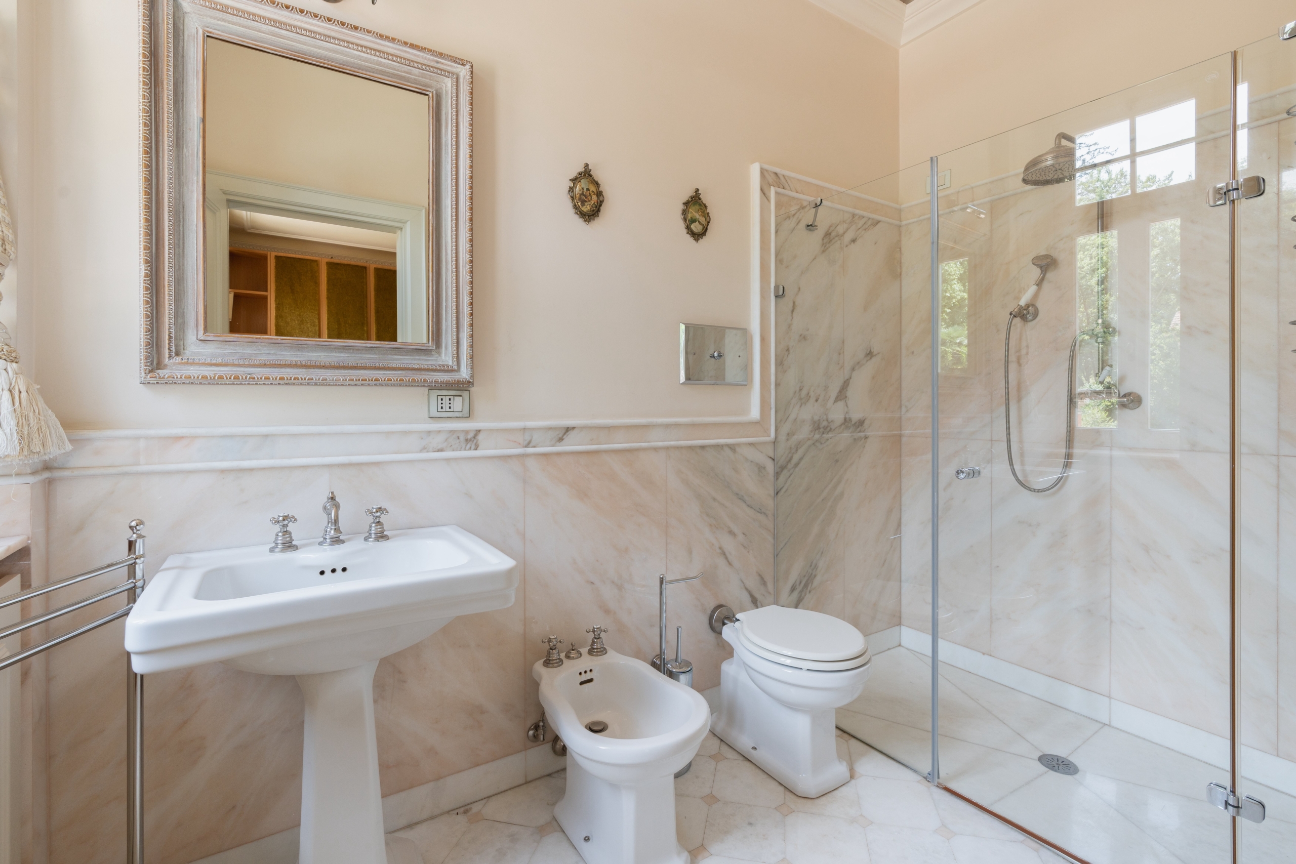 L’immobile dispone, tra i numerosi servizi, di una zona biblioteca, di un’ampia sala da pranzo, di un salotto padronale e di quattro camere da letto principali. Tra queste spicca per bellezza la “master suite” dotata di bagno in marmo e cabina armadio dedicata. Oltre a ciò, la proprietà dispone di una cucina professionale attrezzata che, insieme ad un’ulteriore sala da pranzo ed alla sala cinema, occupa il livello seminterrato.
