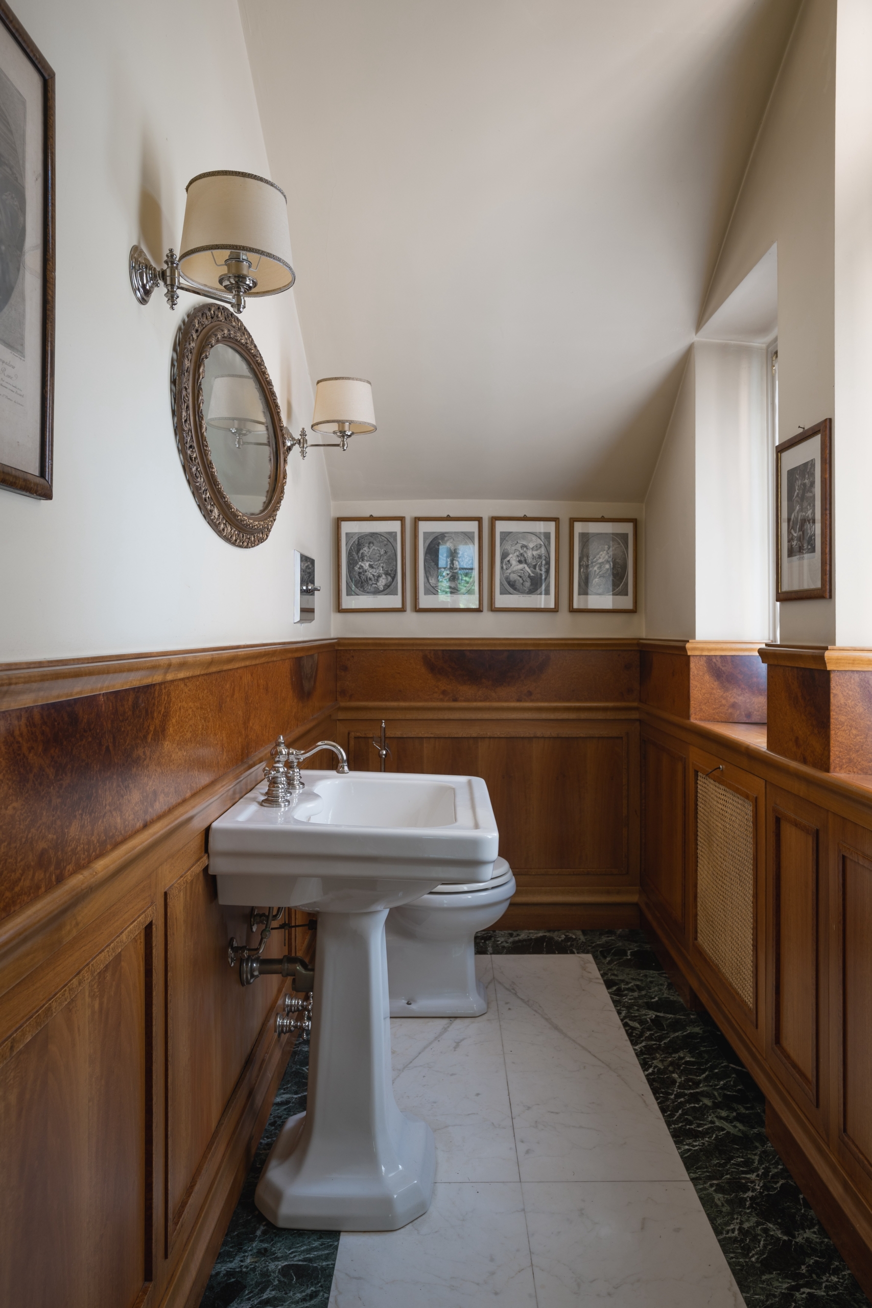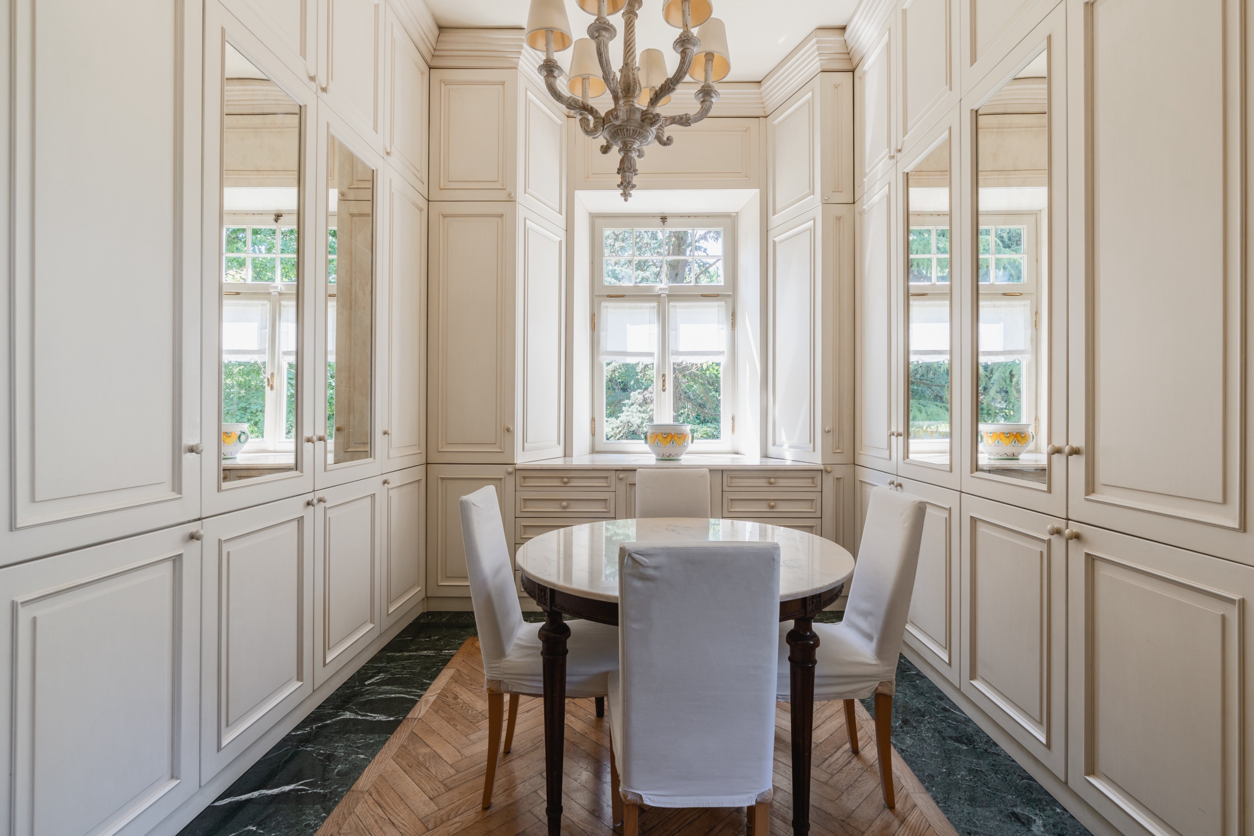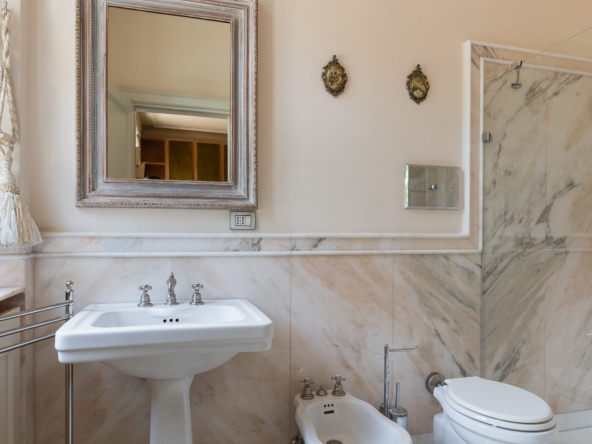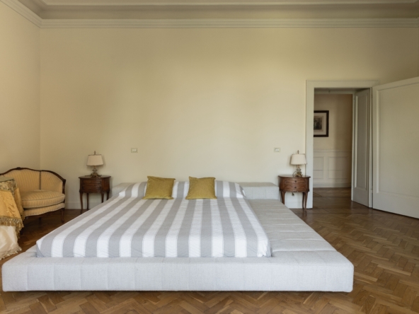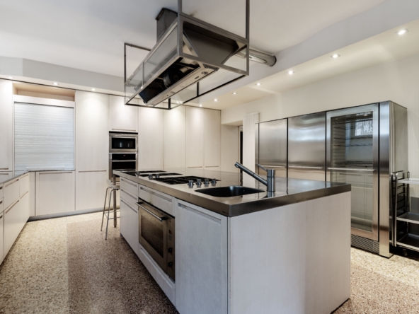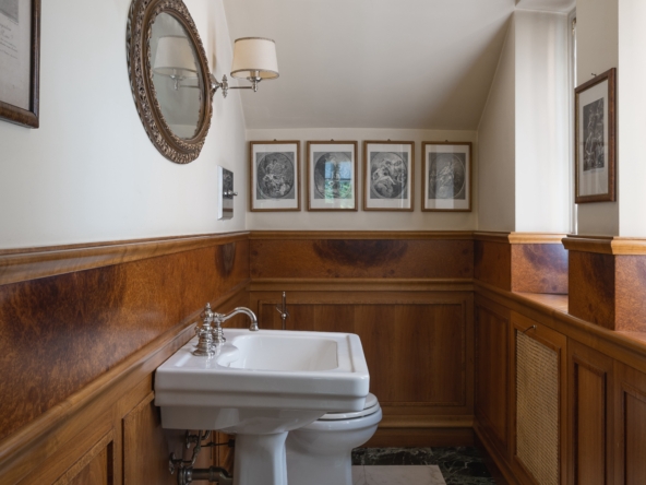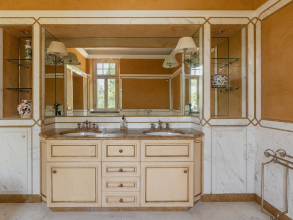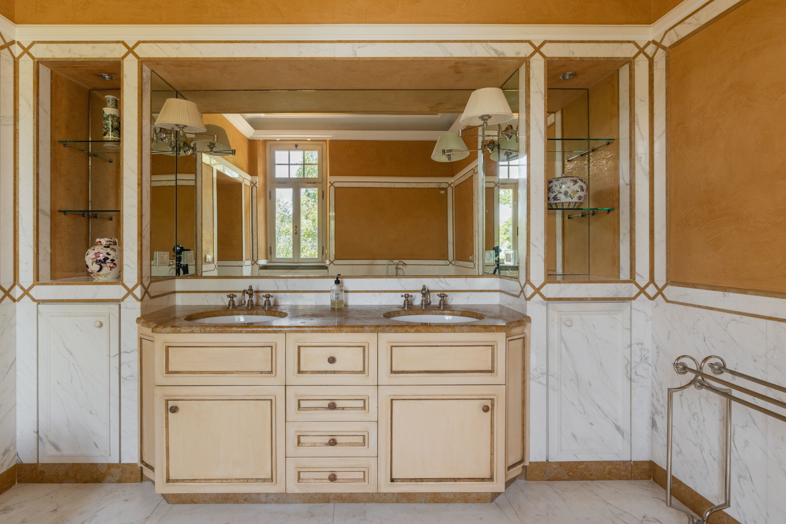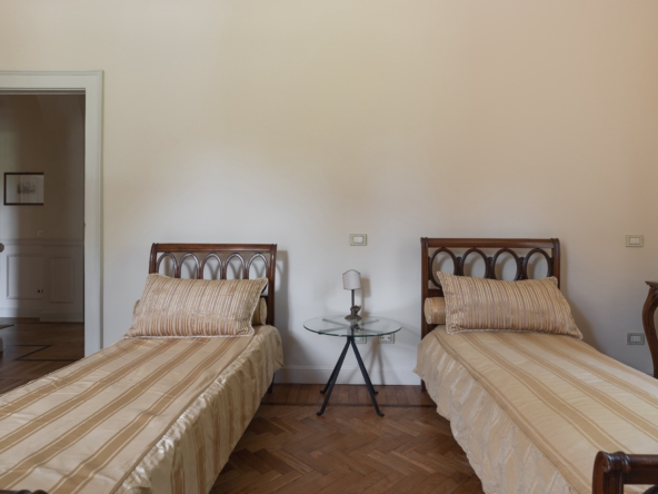 L’immobile dispone, tra i numerosi servizi, di una zona biblioteca, di un’ampia sala da pranzo, di un salotto padronale e di quattro camere da letto principali. Tra queste spicca per bellezza la “master suite” dotata di bagno in marmo e cabina armadio dedicata. Oltre a ciò, la proprietà dispone di una cucina professionale attrezzata che, insieme ad un’ulteriore sala da pranzo ed alla sala cinema, occupa il livello seminterrato.